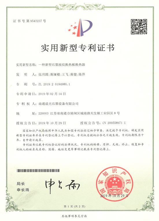 實(shí)用新型專利 :石墨換熱器 專利號(hào):ZL 2019 2 1407837.2